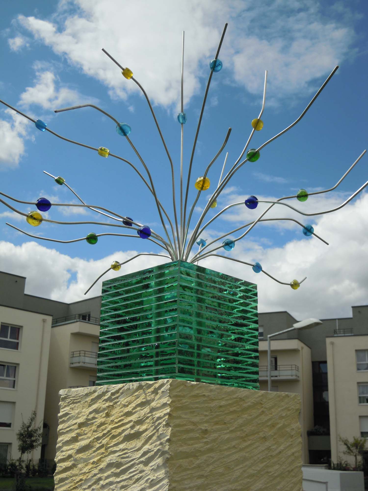 Sculpture : dalles de verre, pierre de Caen, granit bleu, inox, cabochons de verre, colle silicone et encre . 2012