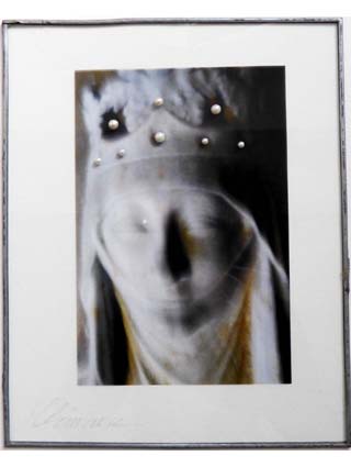 Impression numérique sur plaque de verre sertie de plomb, incrustation de perles, gravure à la meule et pigments . Dimension : 20x25cm . 2015